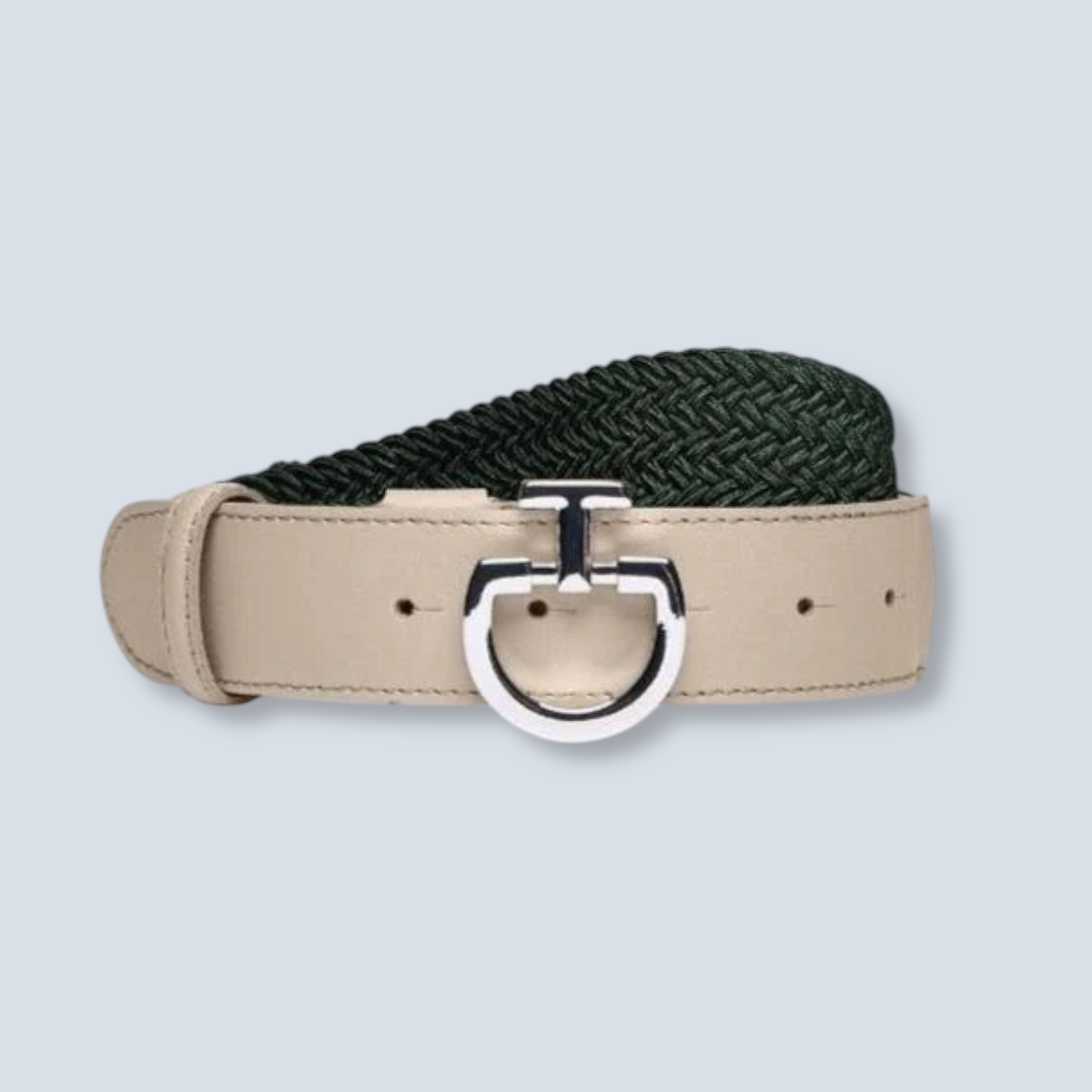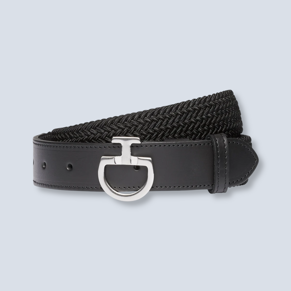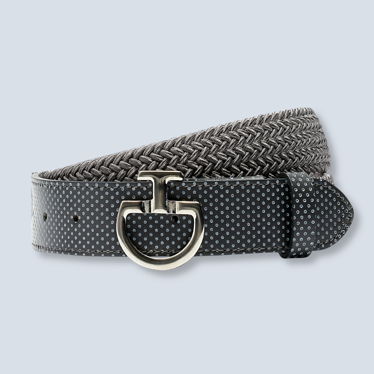 This men's belt features braided leather with an elastic rayon band for added flexibility. It has a leather tip and a metal buckle embossed with the logo. The slim, stretchy design ensures comfort and ease of movement during sports activities.