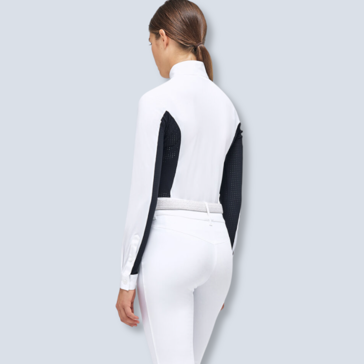 The Cavalleria Toscana long-sleeve competition shirt with perforated inserts is crafted for the most demanding hunter rider. Simple, classic, and elegant, it combines technical fabrics with a refined design. The ideal long-sleeve shirt for the three-ring arena.