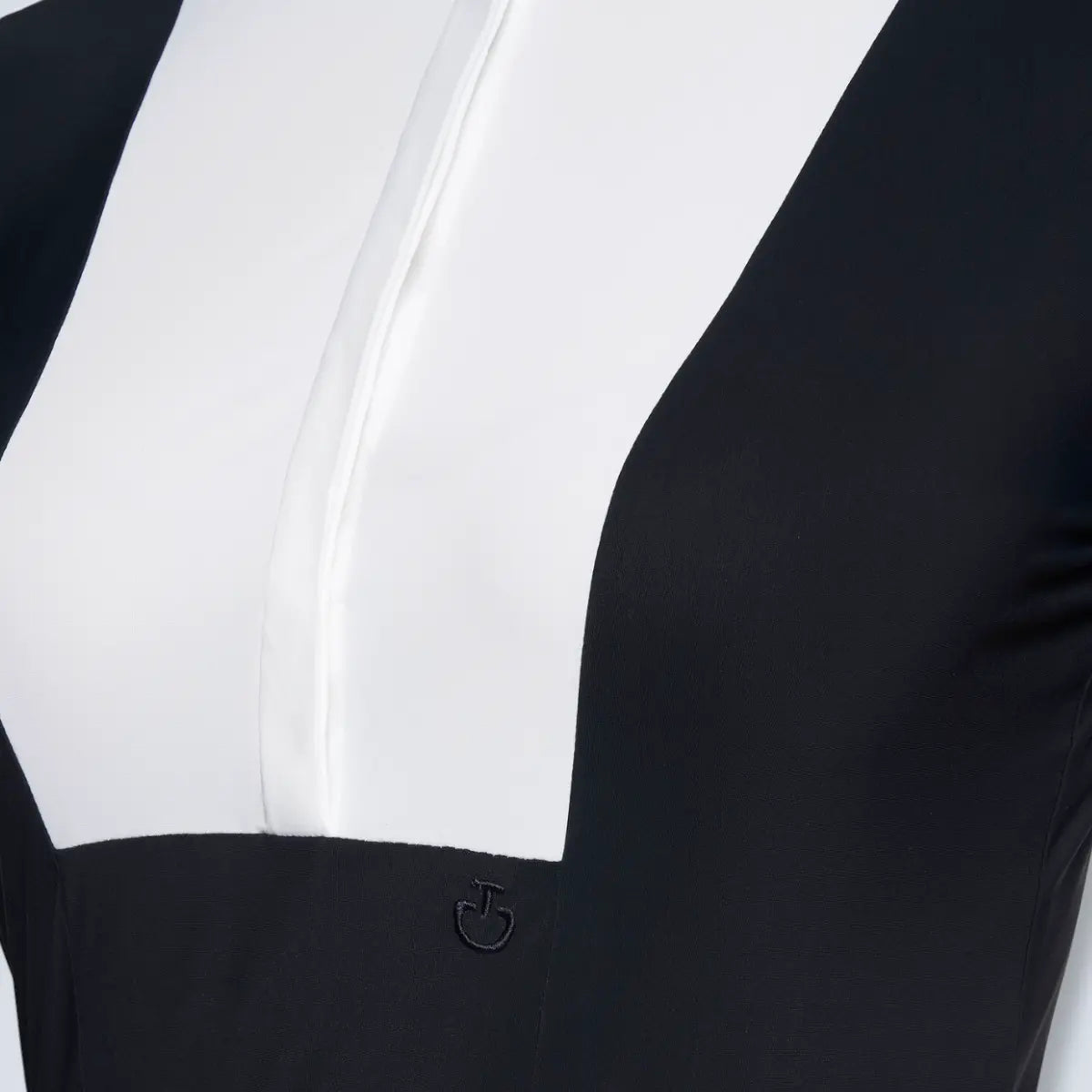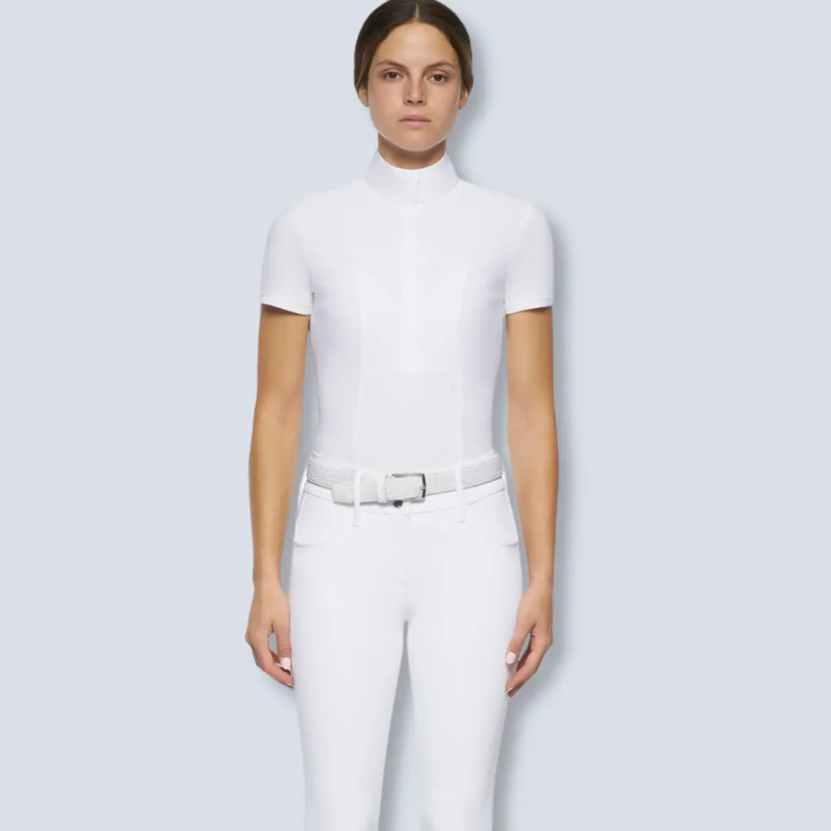 The women's short-sleeve Hunter show shirt features a crisp poplin high collar and a front bib with delicate pleated detailing and hidden buttons. Made from breathable, four-way stretch technical jersey, it offers a flawless fit and moves effortlessly with the rider. A subtle tone-on-tone logo at the front adds a refined finishing touch.