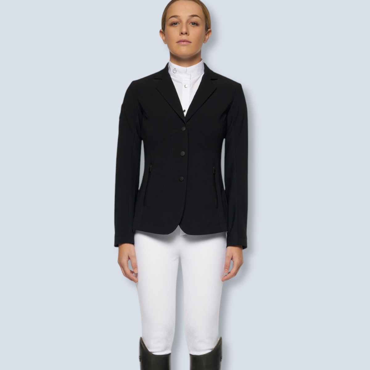 The Cavalleria Toscana Hunter Junior Show Jacket is designed for young riders, blending elegance with performance. Crafted for the Hunter ring, it features a hidden front zipper for a sleek look, stretchy fabric for full mobility, and front pockets for practicality. A subtle CT logo on the shoulder and a tailored back panel add refined finishing touches.