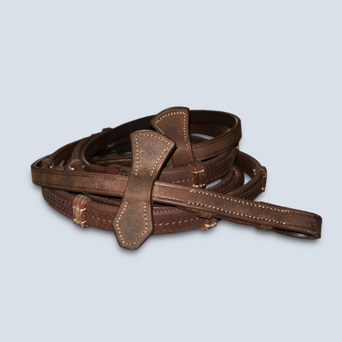Leather reins featuring soft, flexible Bio Grip rubber. Stainless steel buckles and studs. Narrow reins with solid rubber grip for enhanced control.