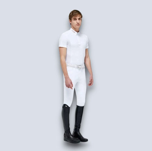 The Cavalleria Toscana polo shirt represents a refined evolution in equestrian show apparel. Crafted from REVO mesh jersey, it features shoulder and back inserts that enhance airflow, wick away moisture, and keep the skin feeling cool and dry. The design is finished with a traditional collar adorned with elegant CT embroidery and a quarter-zip closure set into heat-sealed seam tape for a sleek, modern look.