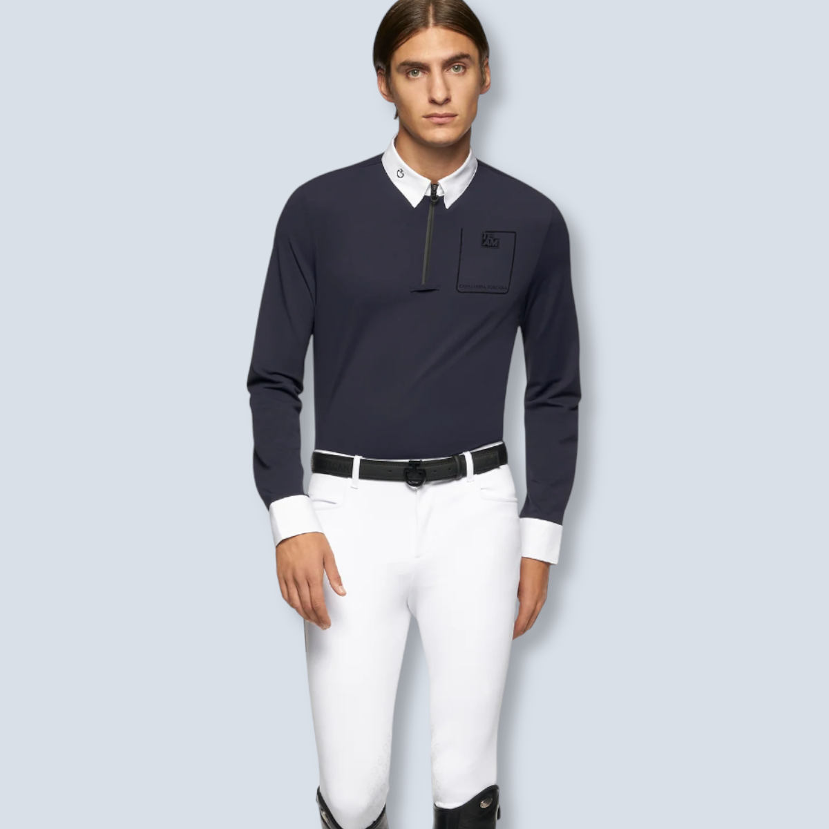 Competition shirt featuring a zipper, long sleeves, and poplin fabric on the pointed collar and cuffs. This men's long-sleeve shirt combines elegance and sophistication, specifically crafted for competitions. Made from soft yet sturdy performance jersey, it resists wrinkles and tears. The contrasting poplin on the pointed collar and cuffs adds definition to the silhouette, while side slits at the hem provide enhanced mobility. Subtle graphic touches include a zipper pull shaped like the Cavalleria Toscana logo and the Team logo embroidered on the chest, reflecting the brand's style.
