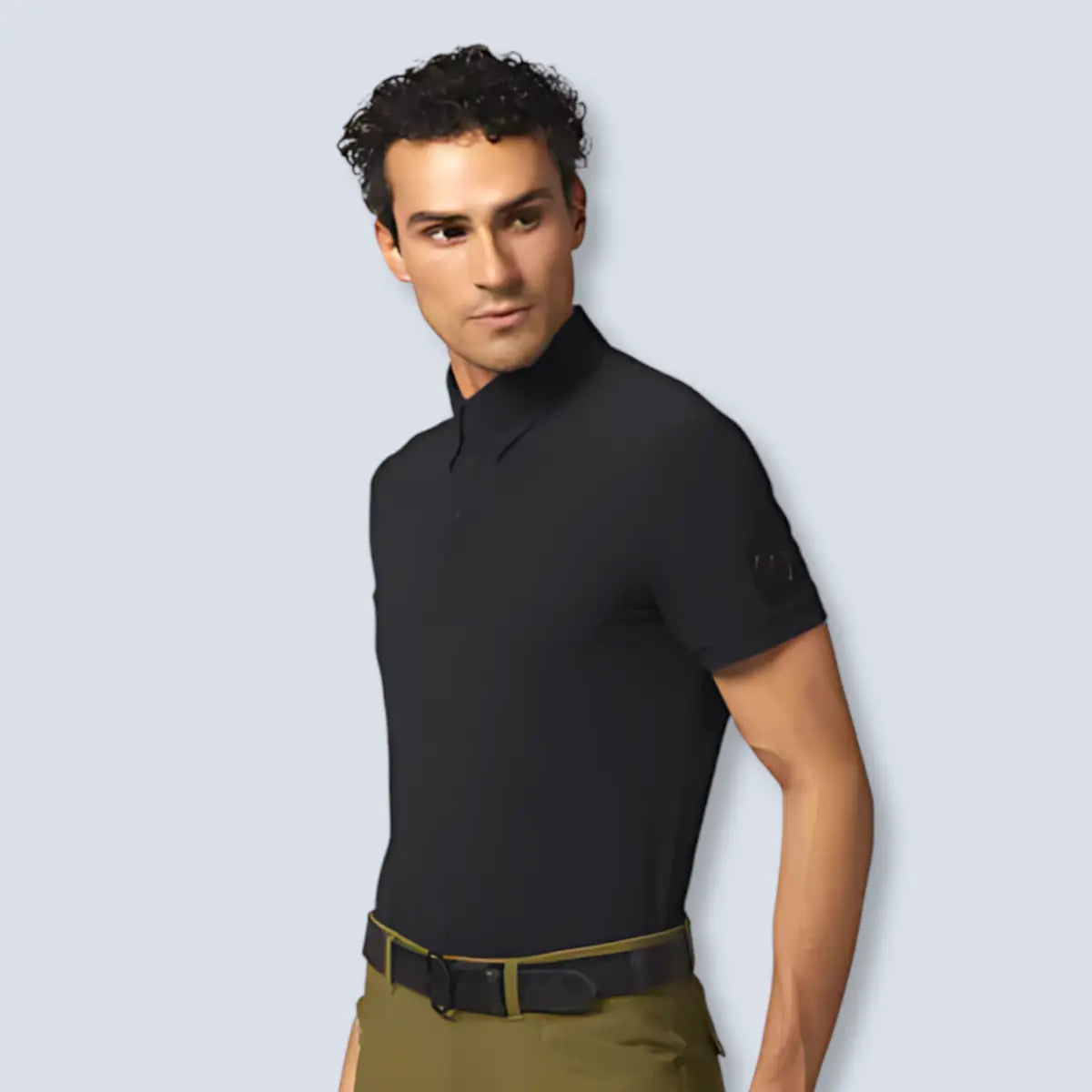 The Faial men’s polo features a piqué jersey fabric with a four-snap button placket and a sleek black square patch on the sleeve.