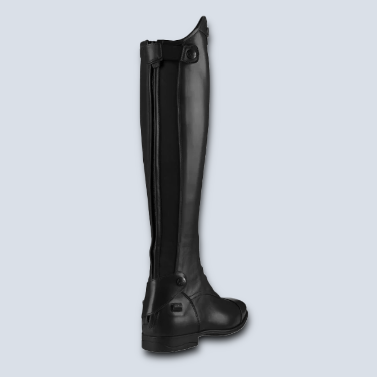 Premium calfskin leather boots with laces and elastic back panel for a sleek, flexible fit.