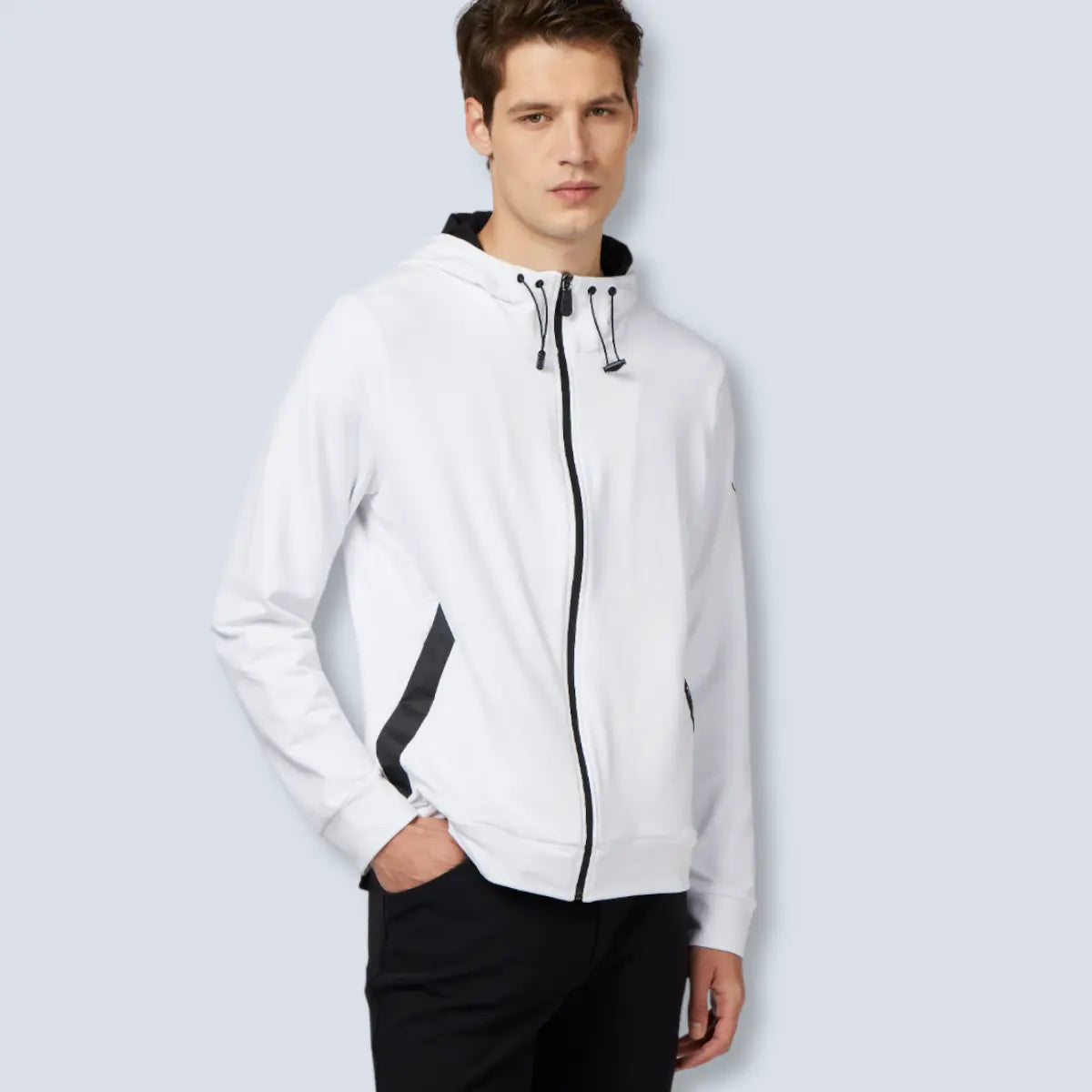 The Brindisi men’s technical hoodie is made from bielastic fabric. Soft and light to the touch with a snug but comfortable fit. On the sleeve and left pocket there is a contrasting application, thus giving originality to the garment.