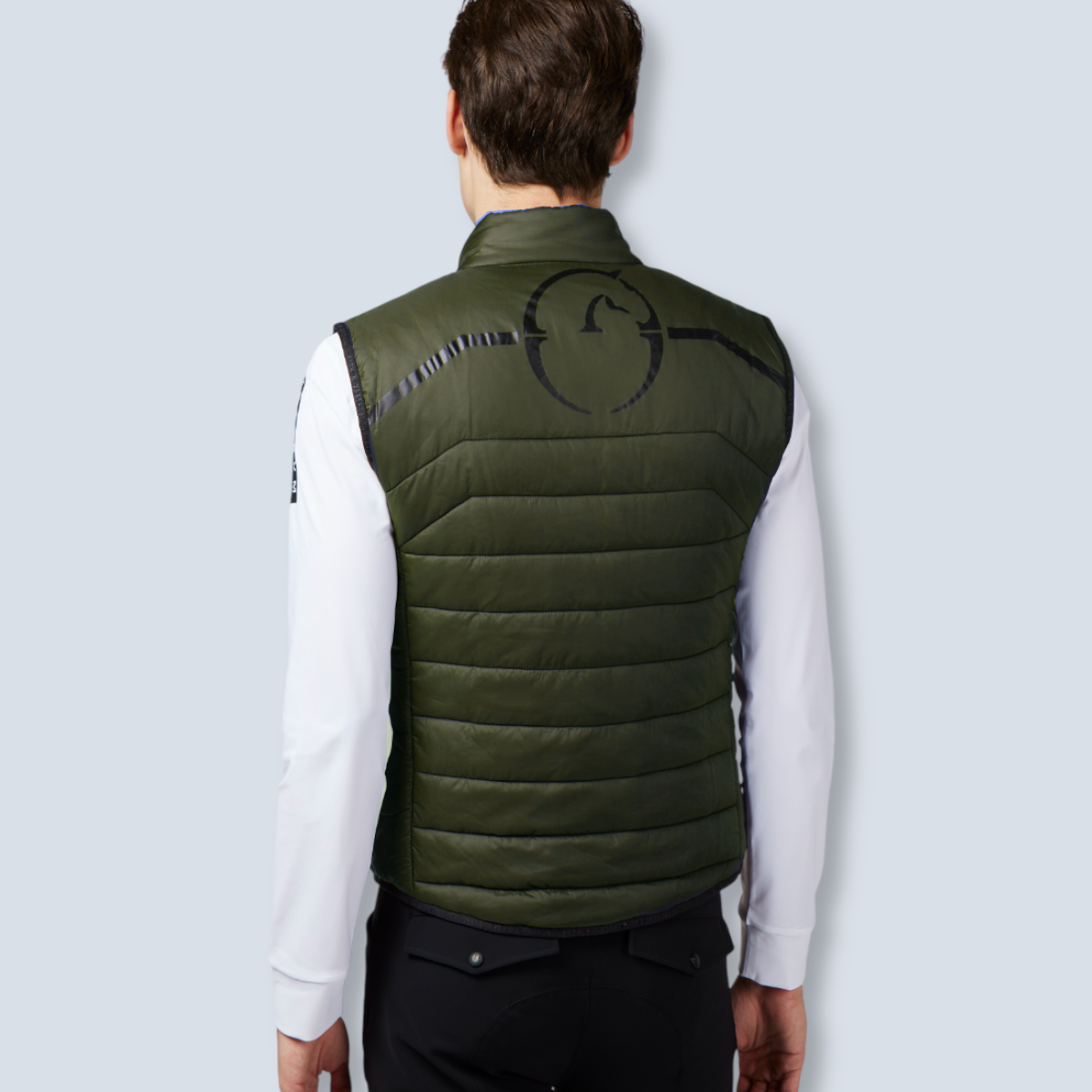 Levanto is a men's padded vest featuring a stand-up collar and crafted from water-resistant, windproof fabric. It showcases perforated Vestrum lettering and a stitched label on the front left, with a Vestrum logo print displayed on the back.