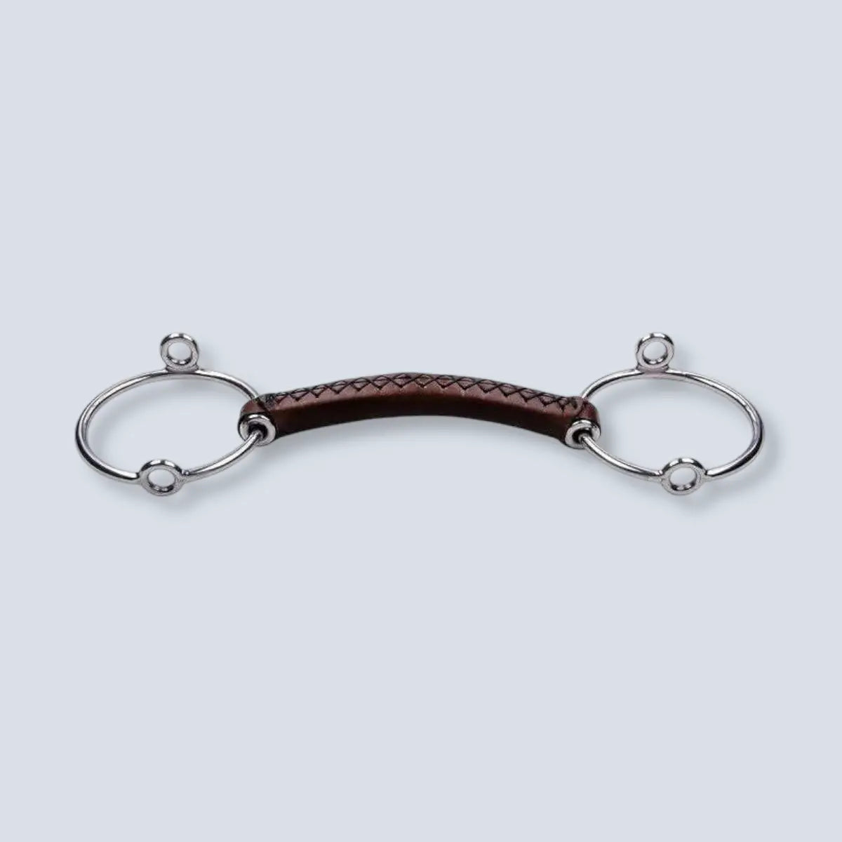 Soft, flexible leather bits suited for sensitive horses. The gag bit encourages the horse to raise its head by applying pressure behind the ears, useful for leaning horses but not for beginners. The straight mouthpiece applies pressure on the tongue, layers, and lips, with more pressure if thicker or without a tongue port.