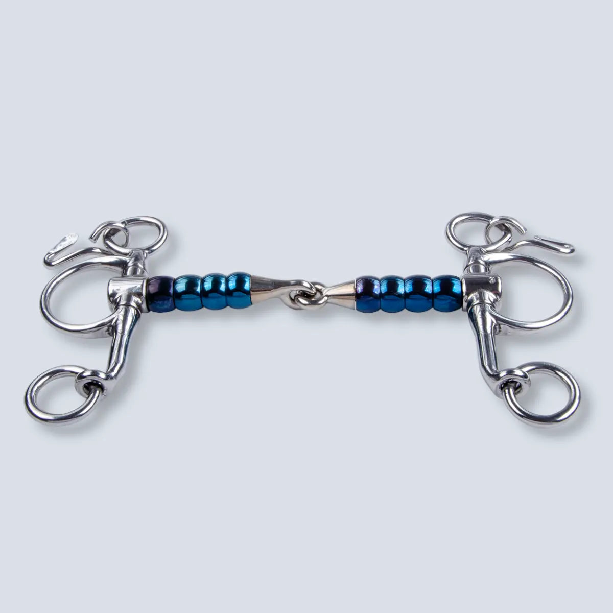 Sweet Iron bits made of blue steel that stimulate salivation with their sweet rust. Baby Pelham provides gentle leverage effect with short shanks and curb chain. Single jointed mouthpiece applies soft tongue pressure. Copper and cherry rollers encourage relaxation and bit acceptance.