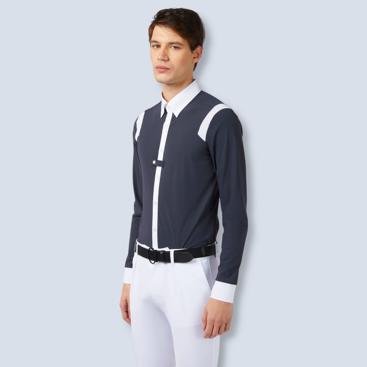 Duisburg is a men's competition shirt crafted from bi-elastic technical jersey, ensuring comfort in any weather. Designed for high performance, it includes a button-up front and mesh sleeve panels for enhanced ventilation. The poplin collar is accented with an embroidered Vestrum logo for a refined finish.
