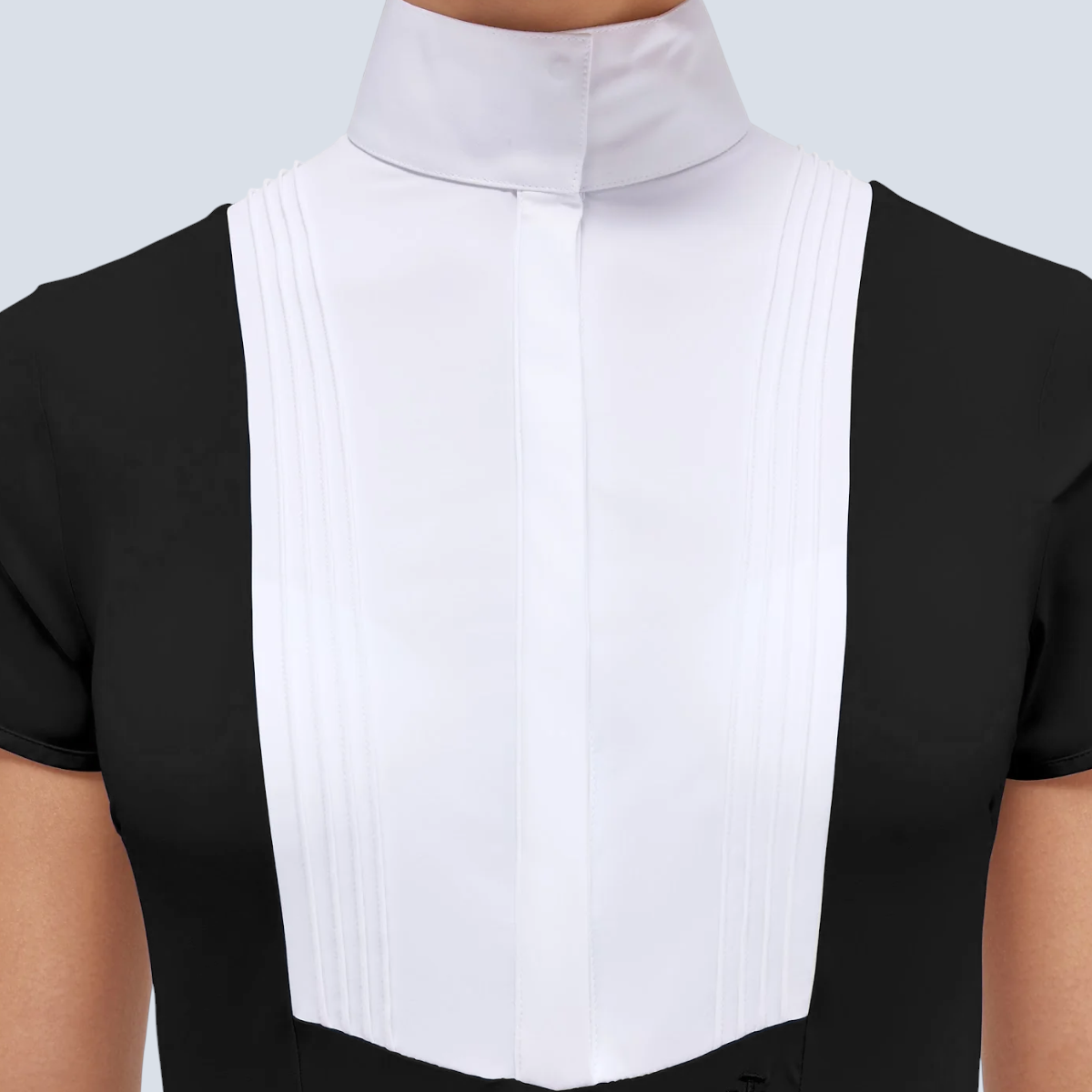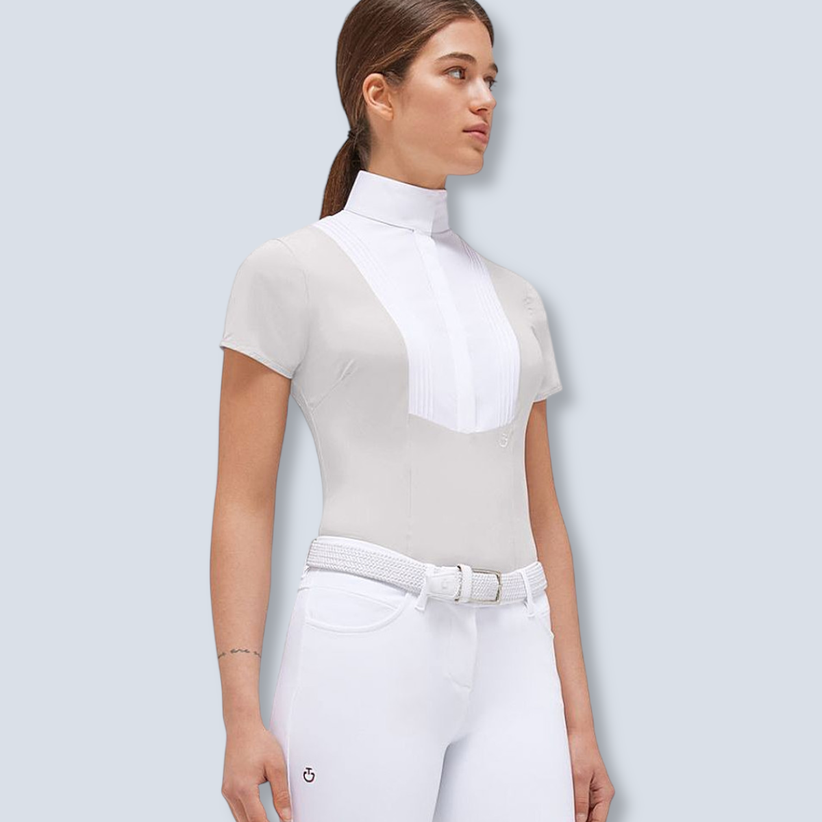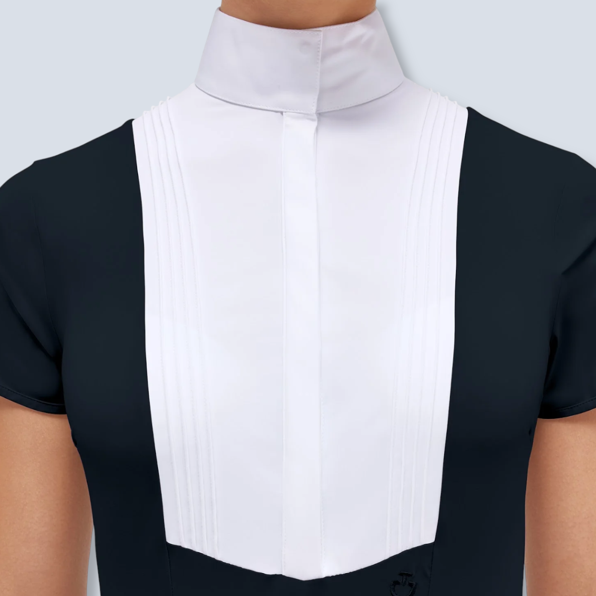 The Cavalleria Toscana American short-sleeve show shirt combines refined style with advanced performance. Designed with a classic bib front and a flattering silhouette, it offers lightweight, breathable comfort for long days in the saddle. Ideal for riders seeking a sharp, professional look in the show ring.