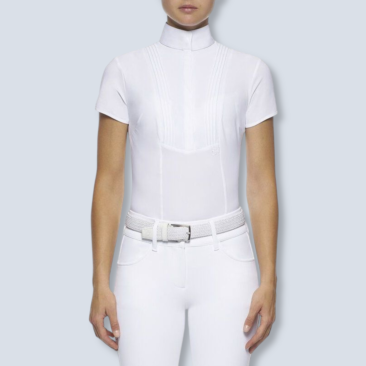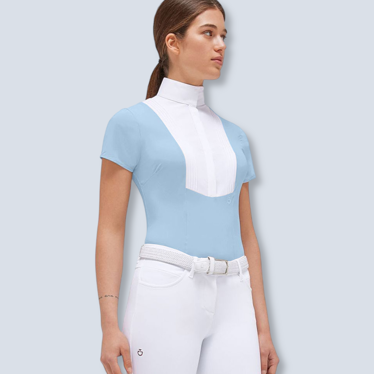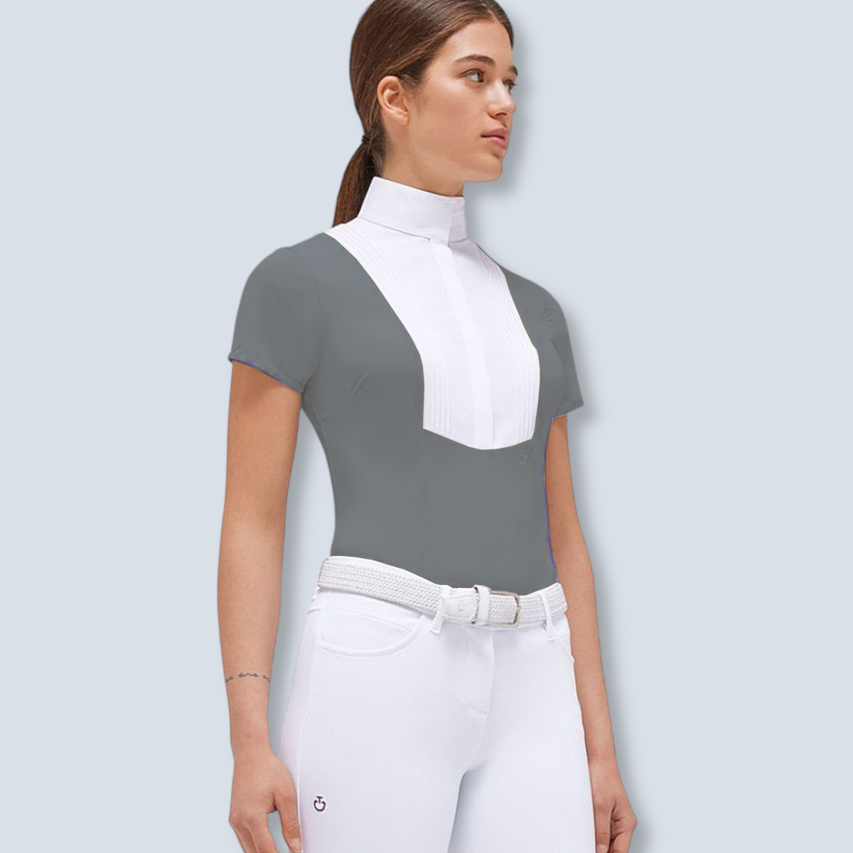 The Cavalleria Toscana American short-sleeve show shirt combines refined style with advanced performance. Designed with a classic bib front and a flattering silhouette, it offers lightweight, breathable comfort for long days in the saddle. Ideal for riders seeking a sharp, professional look in the show ring.