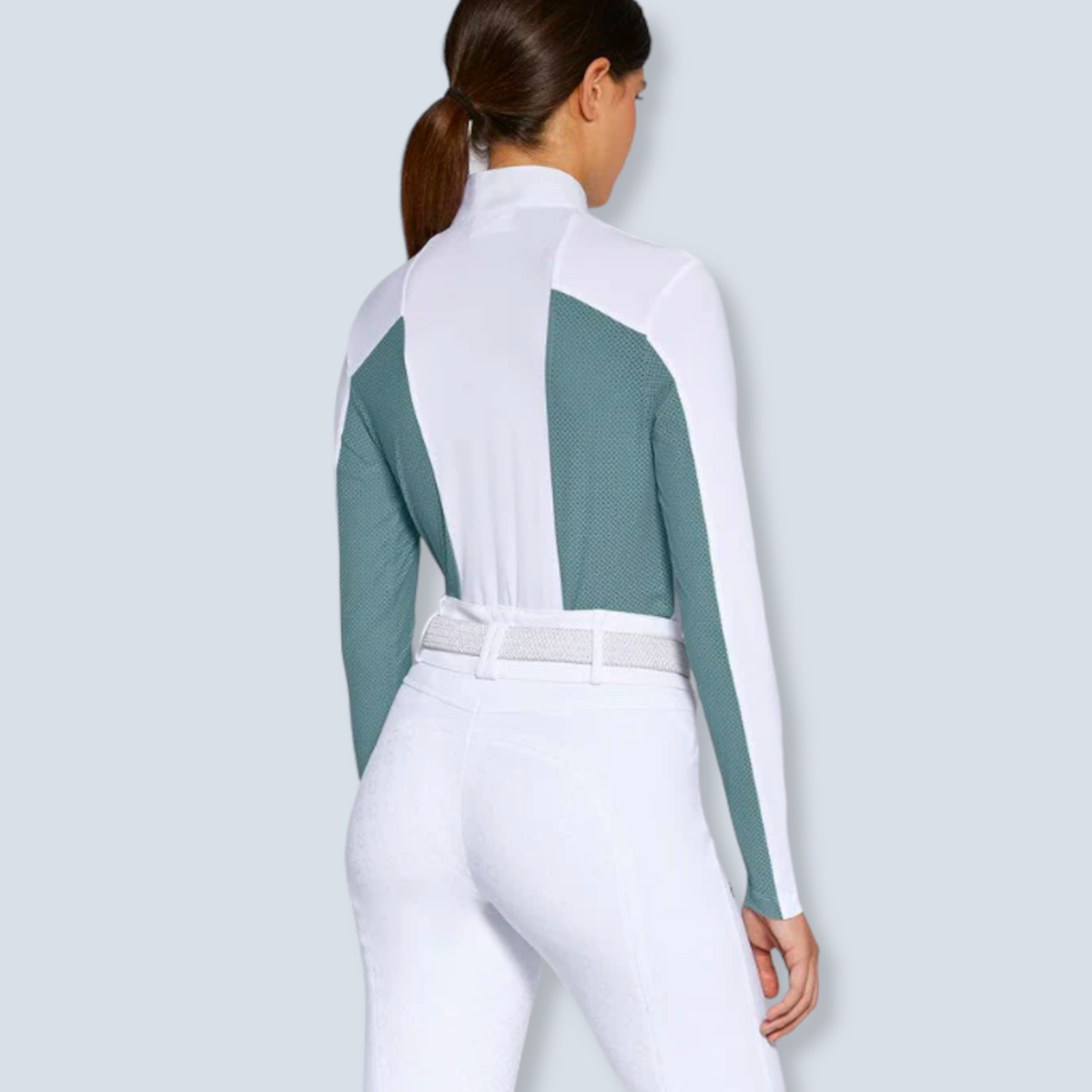 The Cavalleria Toscana Perforated Jersey Zip Competition Polo with Solid Insert is the perfect choice for equestrian enthusiasts looking for a comfortable and functional garment. Crafted from piqué and technical knit, this polo comes in a variety of spring pastel colors. Thanks to its bi-stretch technology, it is easily adaptable to body movements, while its easy care composition makes it easy to wash and maintain. Furthermore, this polo shirt is breathable and fast-drying, ensuring optimal comfort and performance on the saddle.