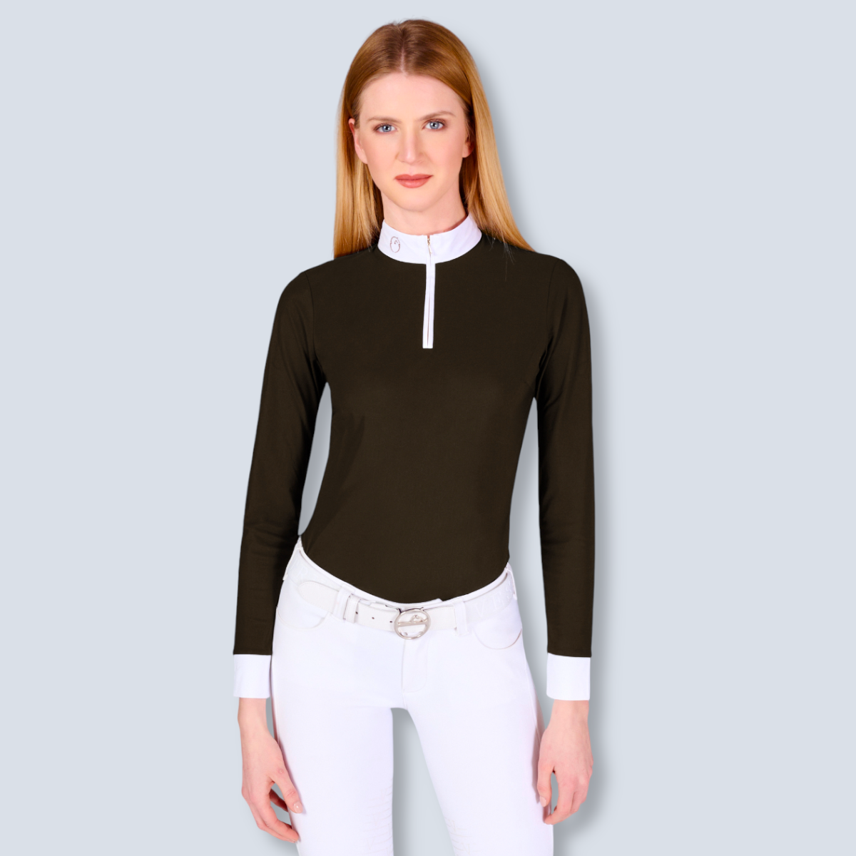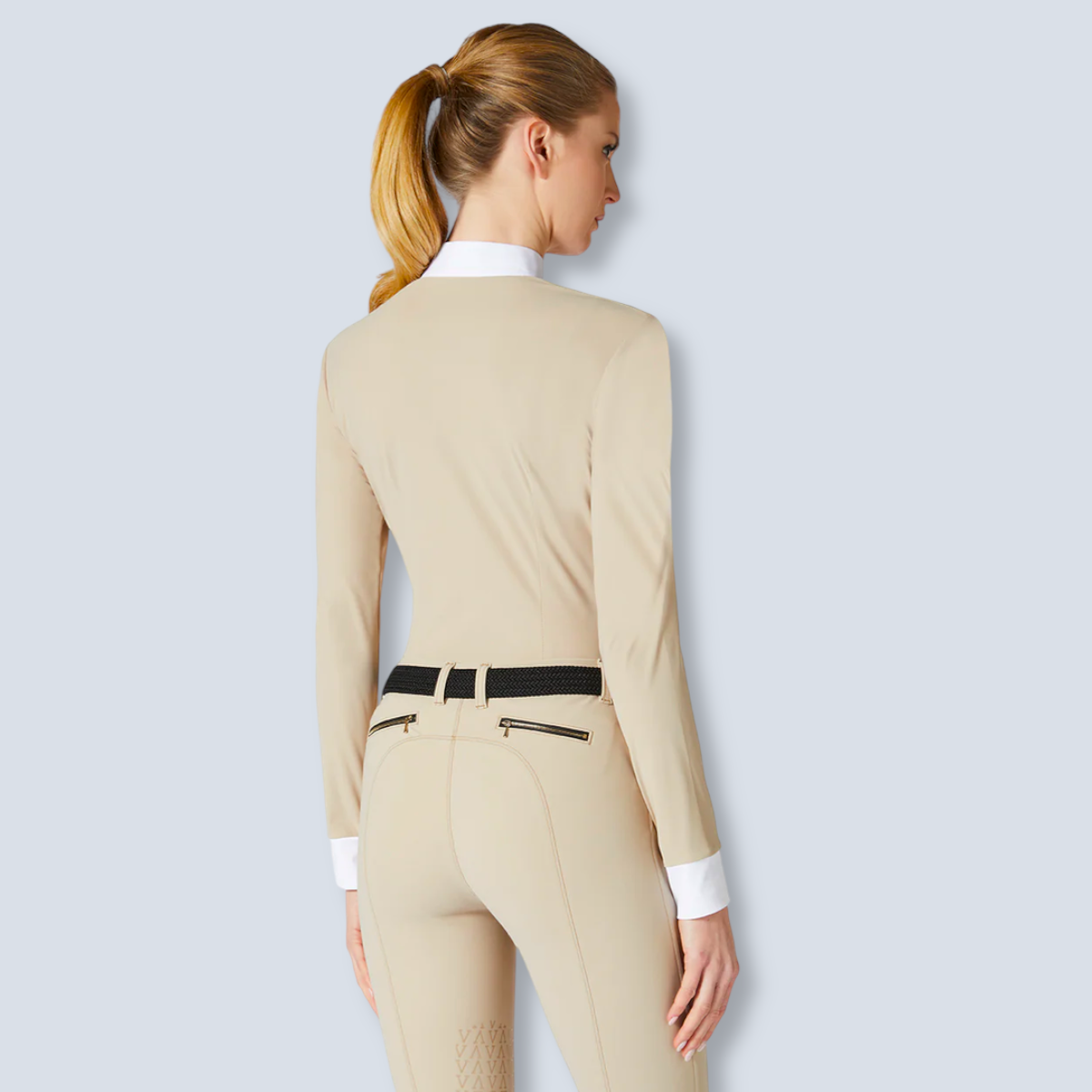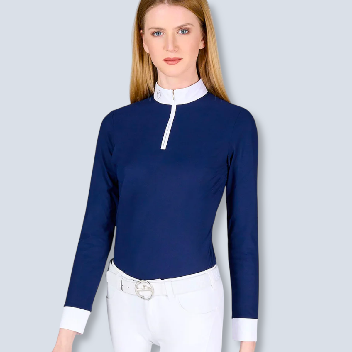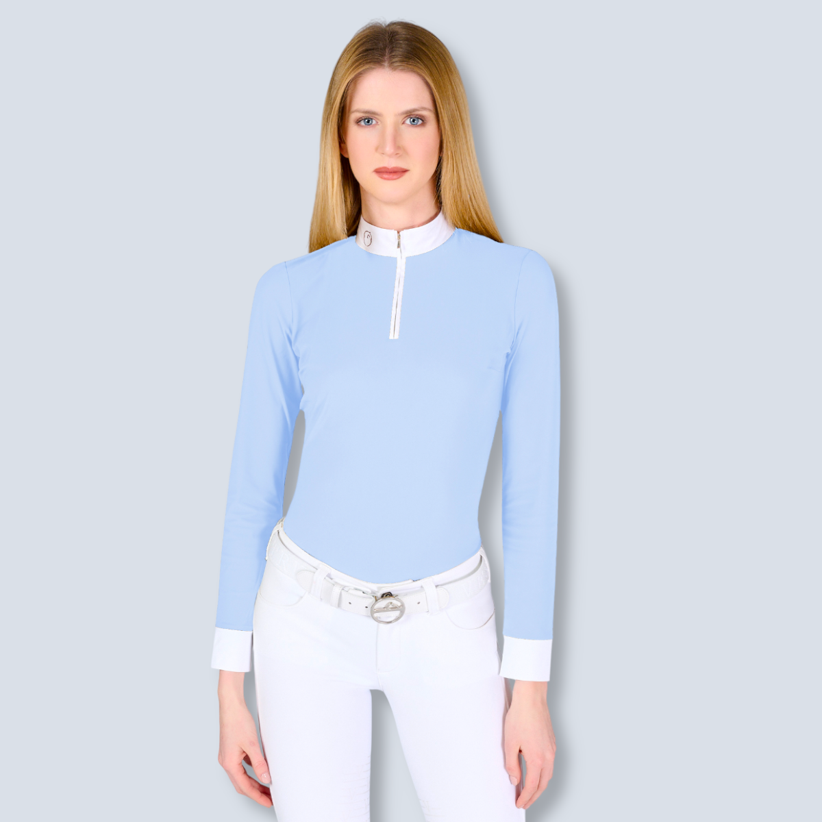Women’s competition shirt Mahon is designed for competition in any wether conditions with the best comfort. Light and breathable bistretch materials, comfortable fit. Long sleeve, stand up collar in popeline with embroidered logo. Fancy golden front zip.